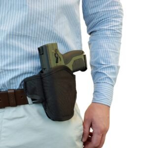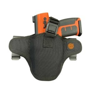 Nuestra funda de nailon para la cintura Byrna presenta un diseño liviano y minimalista que permite un transporte cómodo y ambidiestro durante todo el día dentro de la cintura (IWB) o fuera de la cintura (OWB). El perfil delgado y simple combinado con una parte inferior de boca abierta proporciona un amplio espacio en el cañón para una extracción fácil y un agarre seguro.